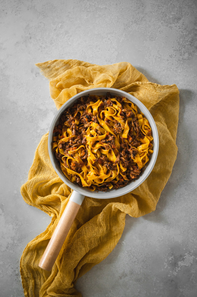 V největším hrnci, jaký doma najdete, přiveďte k varu vodu, přidejte 2 lžíce soli a počkejte 1 minutu. Po této době vložte čerstvé těstoviny a vařte na maximum asi 1,5–2 minuty. K ragú přemístěte hotové tagliatelle pomocí kleští i s trochou vody (díky škrobu z těstovin dodá voda omáčce lesk a lehce ji zahustí). Opatrně promíchejte, jen chvíli provařte a servírujte. Můžete si pomoci kuchařskou pinzetou/kleštěmi a naběračkou.