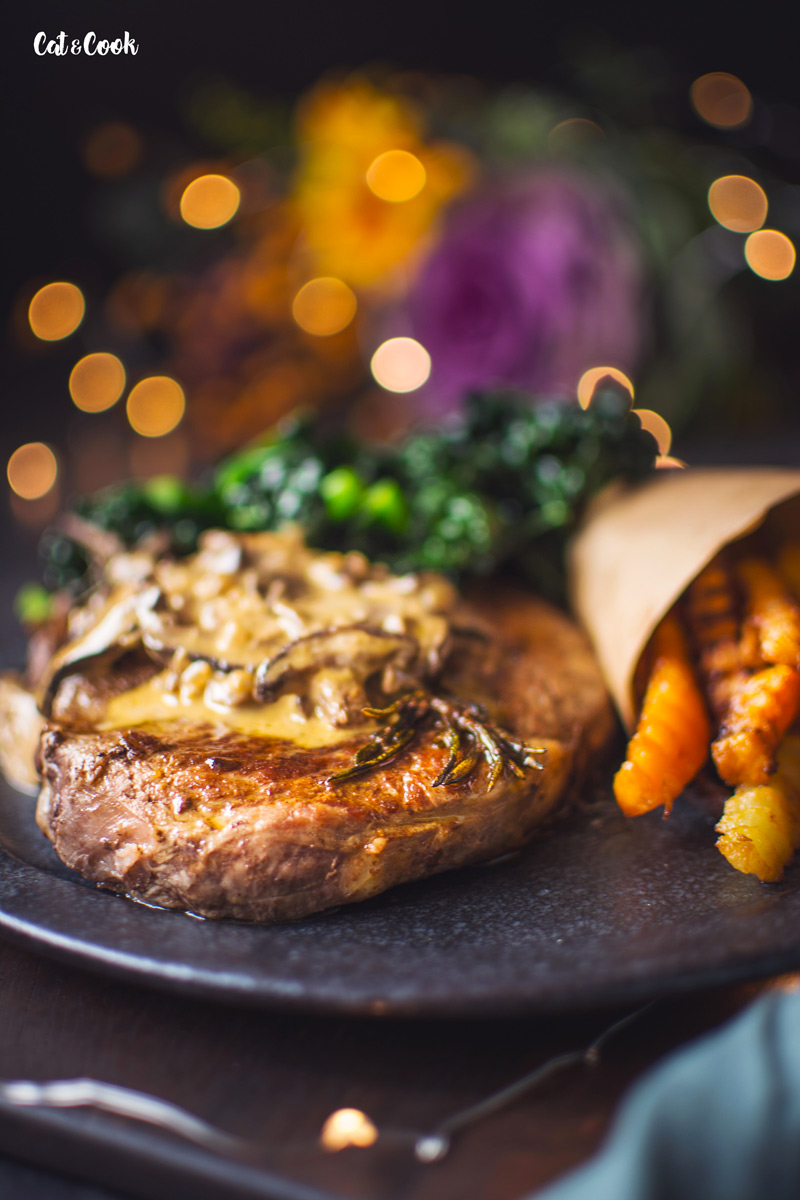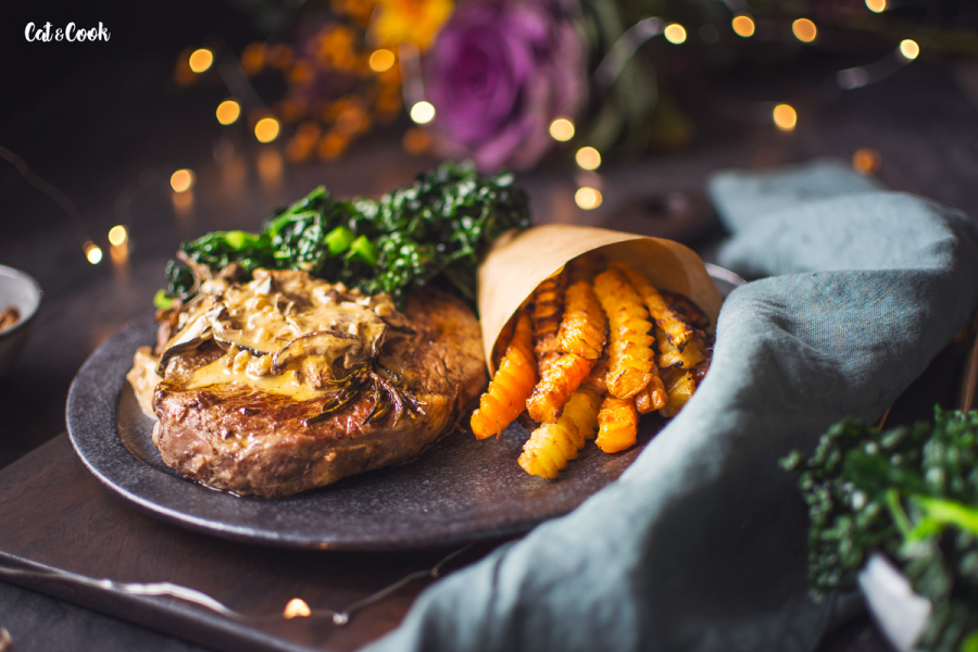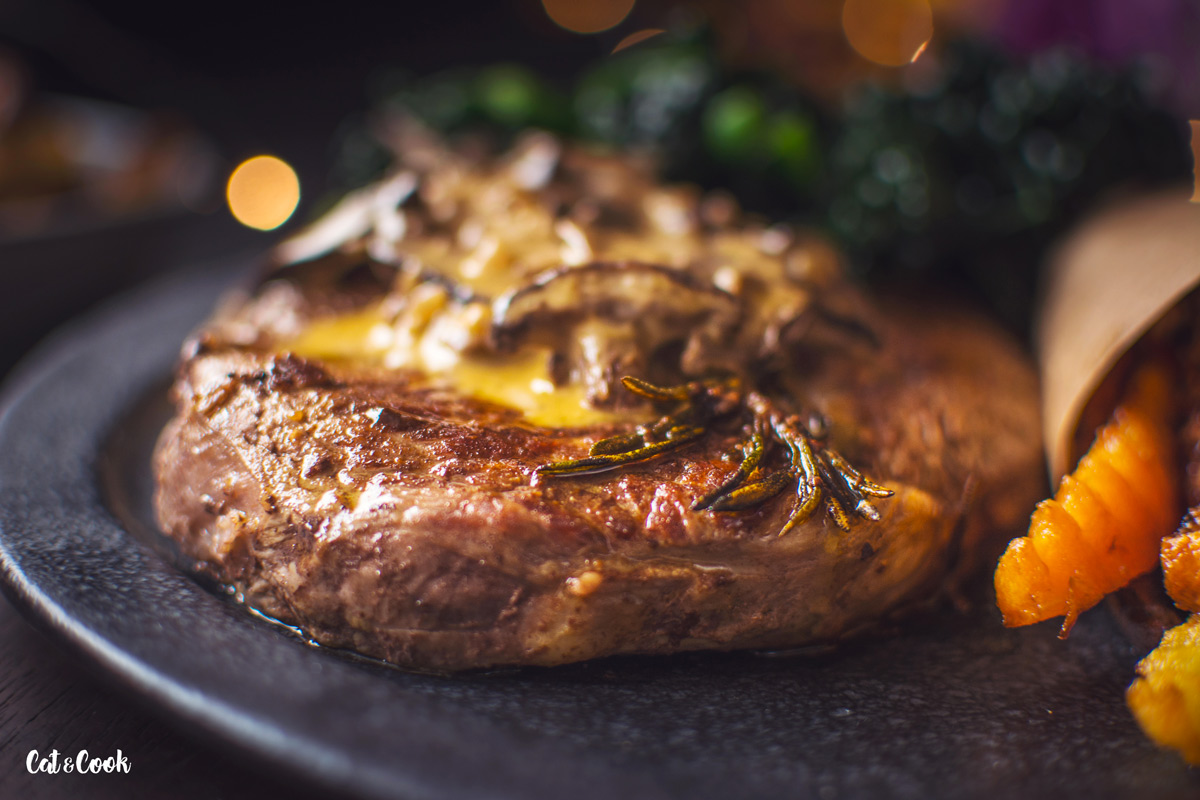 Troubu si rozehřejte na 200 stupňů. Pánev vhodnou do trouby rozpalte na nejvyšší stupeň (bez oleje). Steak lehce potřete z obou stran olivovým olejem a položte na suchou rozpálenou pánev. Opékejte, dokud se maso samo nepustí, poté otočte a opékejte ještě minutu. Ke steakům během smažení přidejte ještě snítku rozmarýnu, 40 g másla a vložte do trouby. Maso propečte ideálně na medium rare. Teploty jsou uvedeny níže, trvá to kolem 3 minutek, ale záleží, jak velké steaky máte. Proto je super mít doma digitální vpichový teploměr, který upotřebíte i na jiné druhy masa. Díky tomu vaše maso už nikdy nebude vysušené 🙂 Steak vyndejte z trouby, přendejte na talíř a volně přikryjte alobalem. Nechte ho 5 – 10 minut odpočinout.