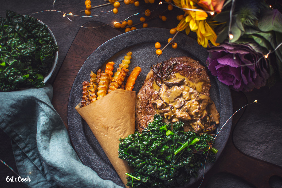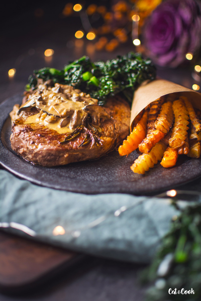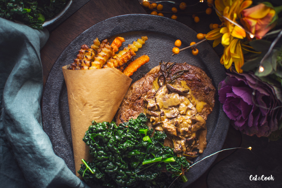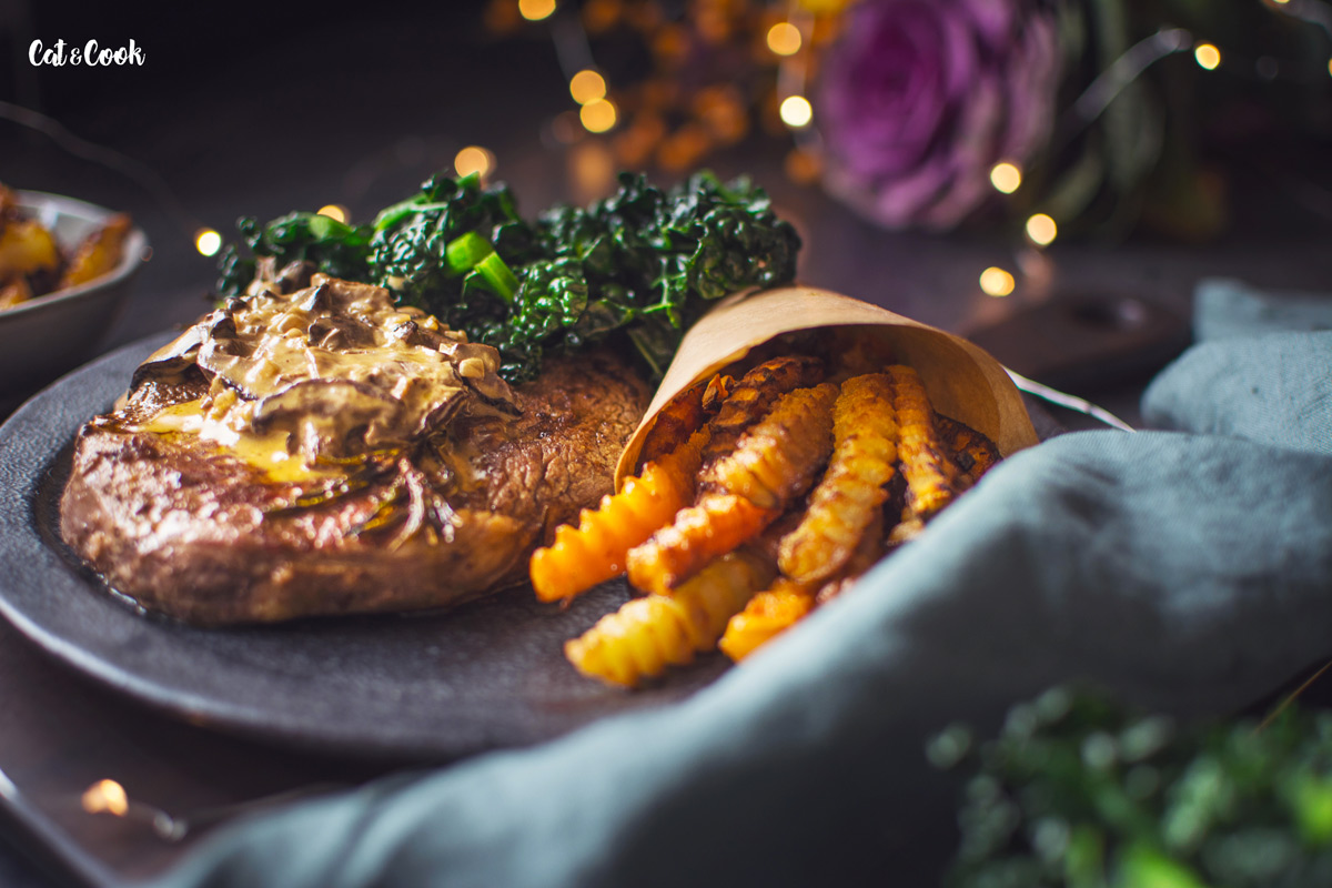 Na omáčku najemno nasekejte šalotku a zpěňte ji na 15 g másla se 2 lžícemi olivového oleje pouze do sklovata. Houby nakrájejte na menší kousky a přidejte k cibulce. Restujte ještě asi 3 minutky na středním plamenu a poté přilijte smetanu. Omáčku za občasného míchání vařte do zhoustnutí, trvá to asi 5 minut. Nakonec dochuťte solí, pepřem a podávejte se steakem, kadeřávkem a zeleninou.