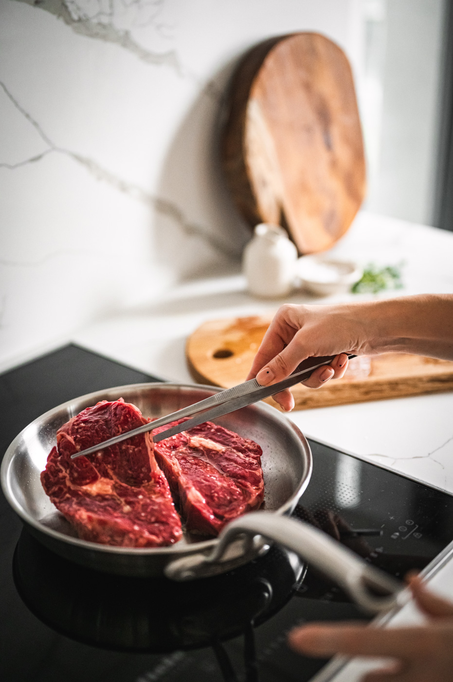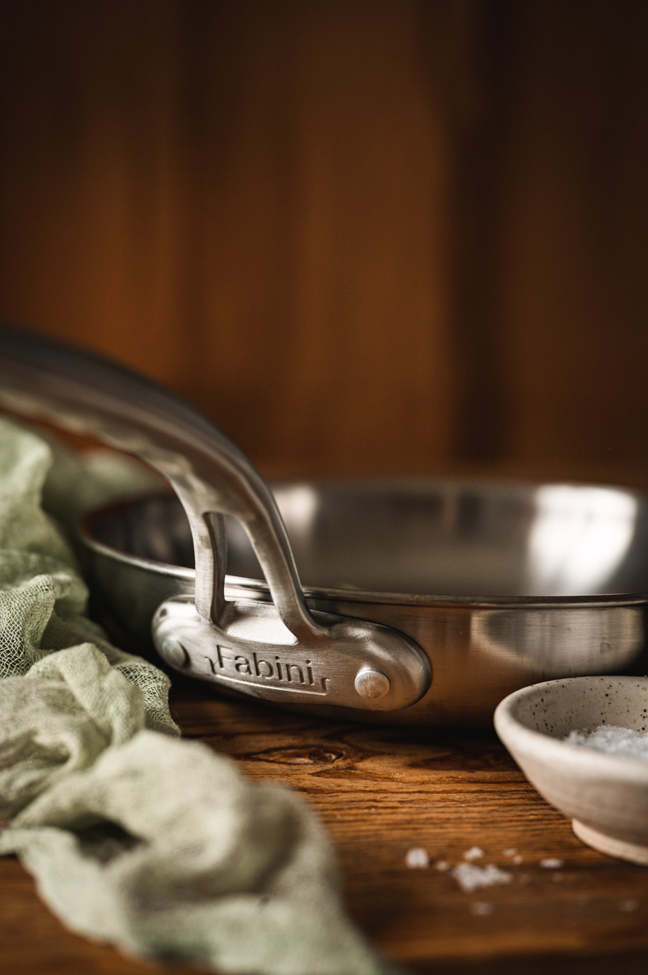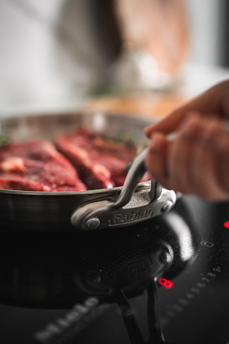 Další neméně důležitou pomůckou je správná pánev. Pánev by totiž neměla mít nepřilnavý povrch, který brání správnému opečení steaku (nedosáhnete krásného hnědého povrchu steaku) a navíc taková pánev není vhodná do trouby. Doporučuji ocelovou pánev od české značky Fabini, která je i mým partnerem. 🙂 Jejich pánve jsou velmi kvalitní, a navíc opravdu krásné! Pánev je vyrobená z 5vrstvé nerezové ocel silné 3 mm. Díky tomu má rovnoměrný rozvod tepla až do okrajů. Ocelovou pánev můžete mýt v myčce, je vhodná i do trouby a funguje na všech vařičích včetně indukce.