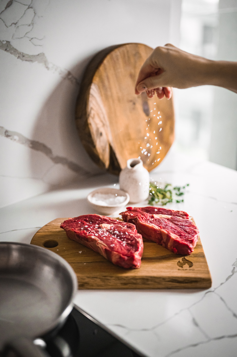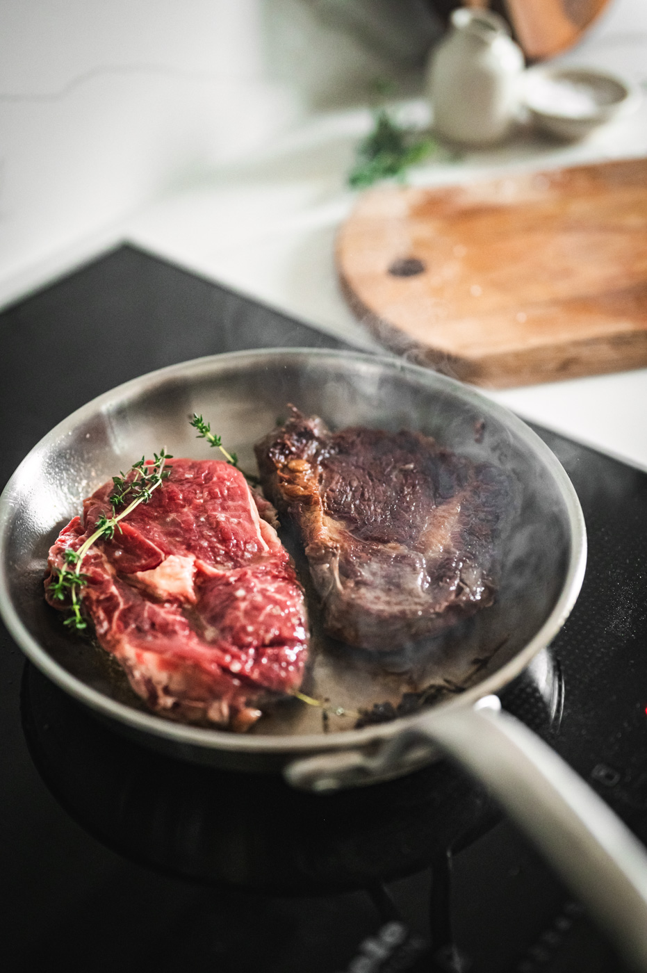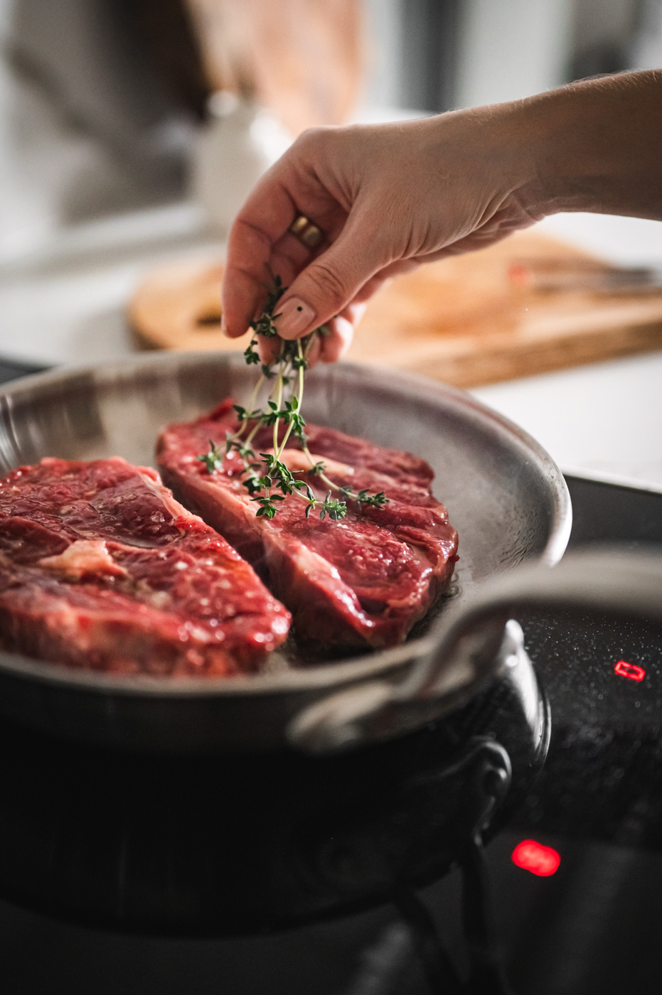 Až budou brambory téměř hotové, začněte s přípravou steaku. Pánev bez nepřilnavého povrchu rozpalte na vyšší stupeň (bez oleje). Steaky lehce potřete ze všech stran olejem a položte na suchou, rozpálenou pánev. Do pánve hoďte bylinky. S masem v pánvi nehýbejte a nechte ho na jednom místě, dokud se samo nepustí. To je známka toho, že dostatečně proběhla tzv. Maillardova reakce – tedy, že maso je dostatečně opečené. Díky tomu nám vznikne krásná zkaramelizovaná plocha, která bude mít dokonalou chuť! 🙂