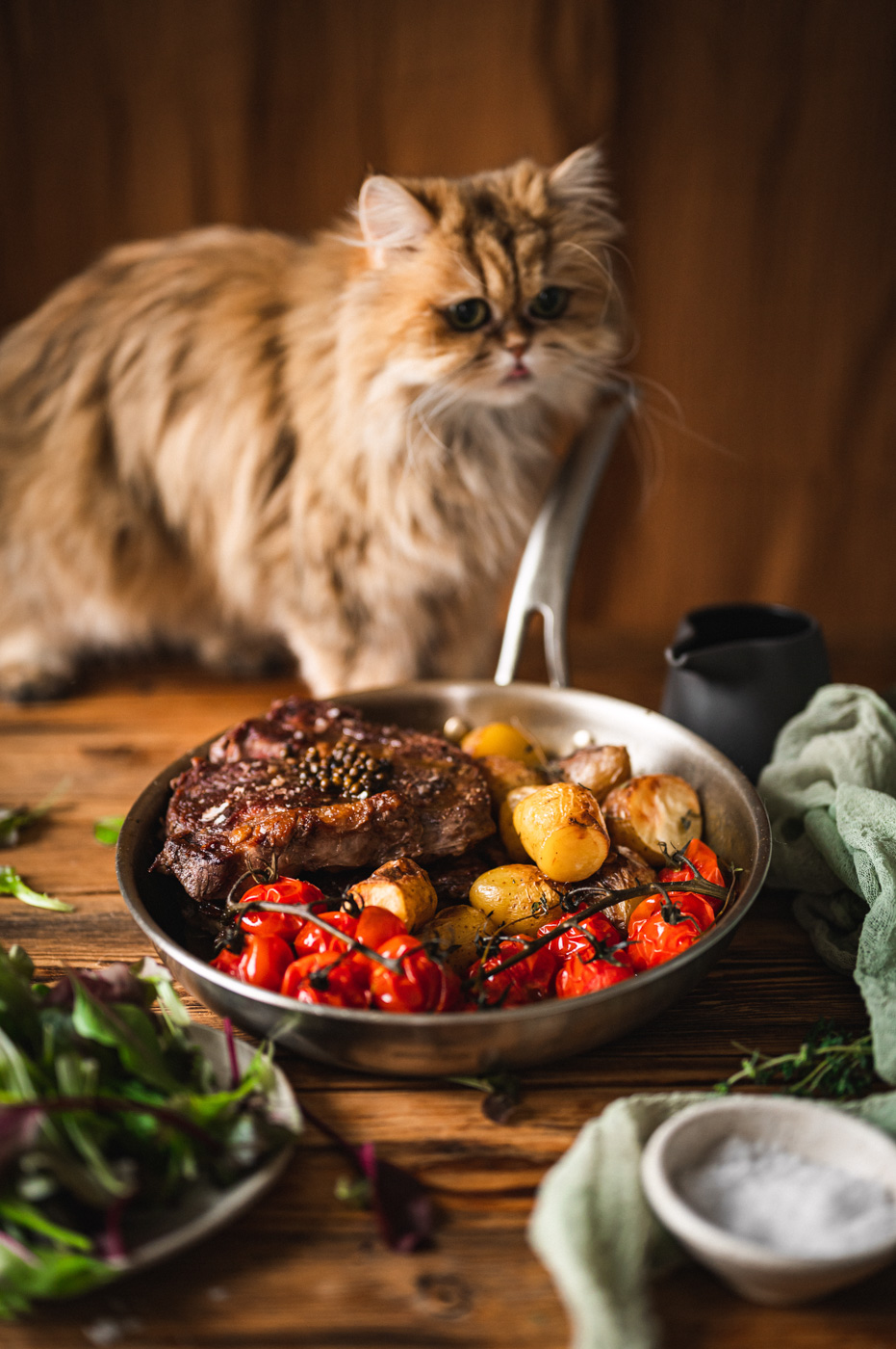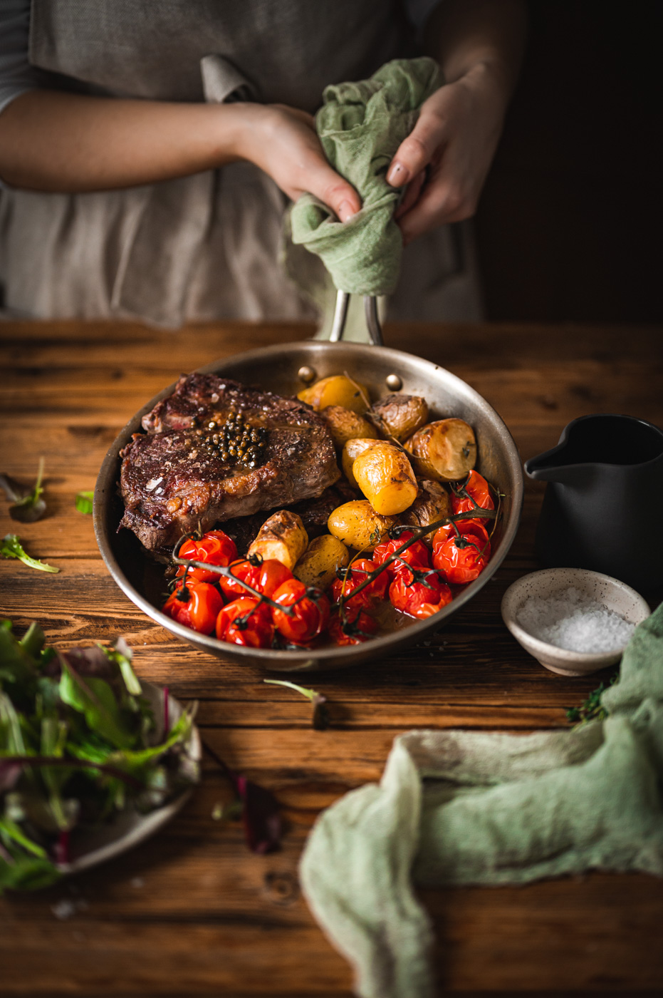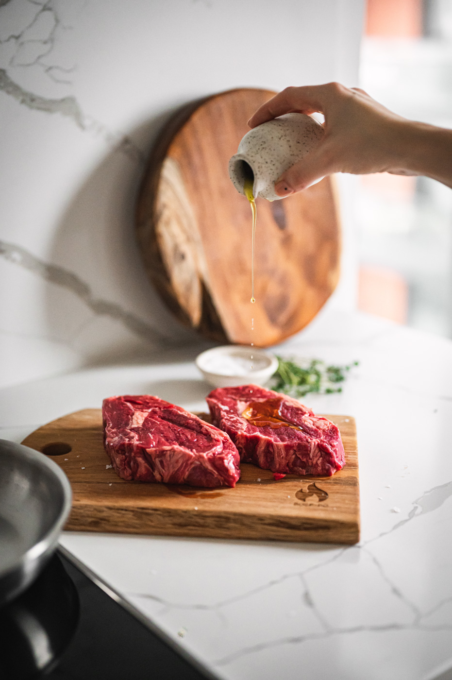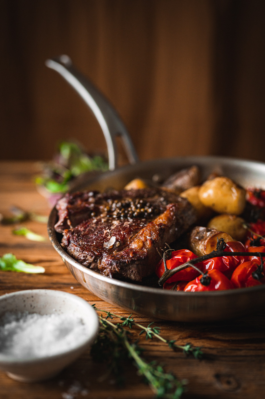 Až budou brambory téměř hotové, začněte s přípravou steaku. Pánev bez nepřilnavého povrchu rozpalte na vyšší stupeň (bez oleje). Steaky lehce potřete ze všech stran olejem a položte na suchou, rozpálenou pánev. Do pánve hoďte bylinky. S masem v pánvi nehýbejte a nechte ho na jednom místě, dokud se samo nepustí. To je známka toho, že dostatečně proběhla tzv. Maillardova reakce – tedy, že maso je dostatečně opečené. Díky tomu nám vznikne krásná zkaramelizovaná plocha, která bude mít dokonalou chuť! 🙂