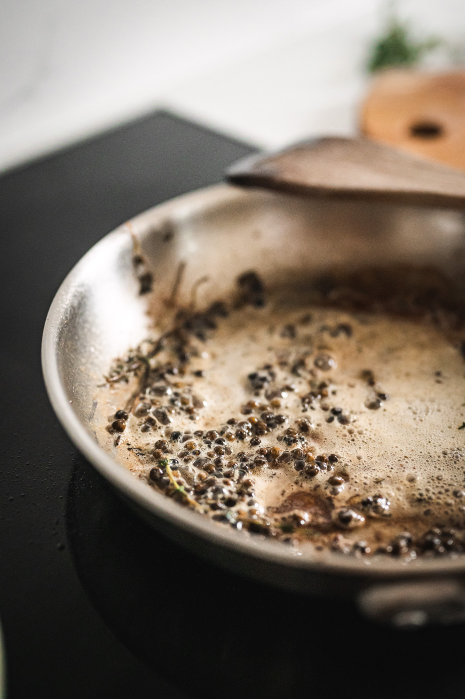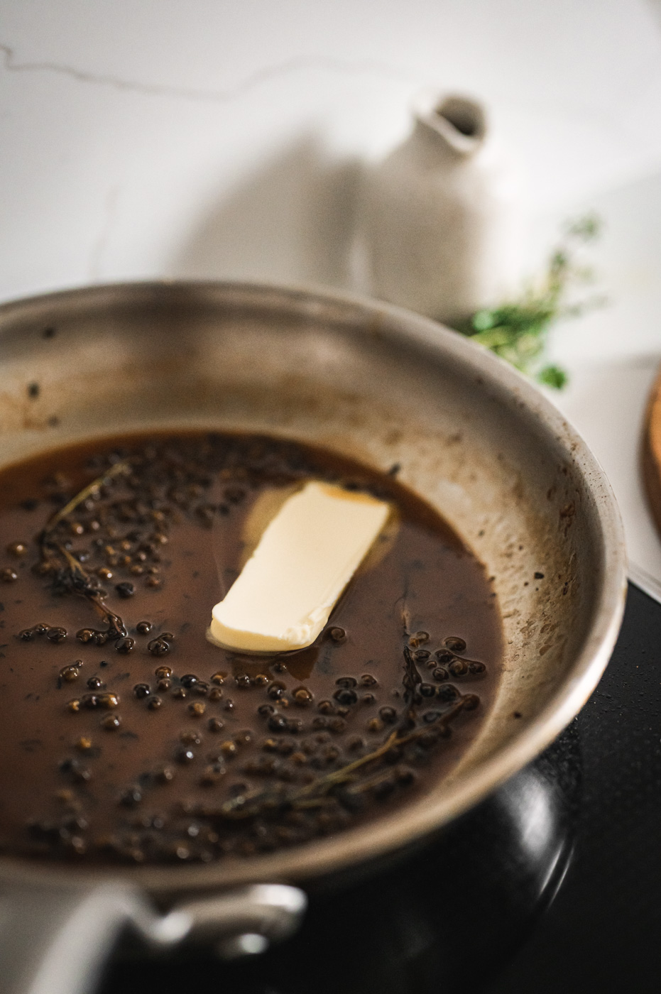 Na pánvi, ve které jste připravovali maso si ještě připravte omáčku. Do horké pánve vložte polovinu másla a pomocí vařečky s rovnou hranou deglazujte pánev. To znamená, abyste seškrábli všechen nápek z masa, který se při restování vytvořil. Do pánve nasypte pepř a na středním stupni asi minutu restujte. Poté nalijte vývar a chvíli redukujte. Poté sundejte z plotny, počkejte 3 minuty a vhoďte zbytek másla (pozor, máslo musí být studené z lednice). Vychlazené máslo vytvoří krémovou konzistenci omáčky.