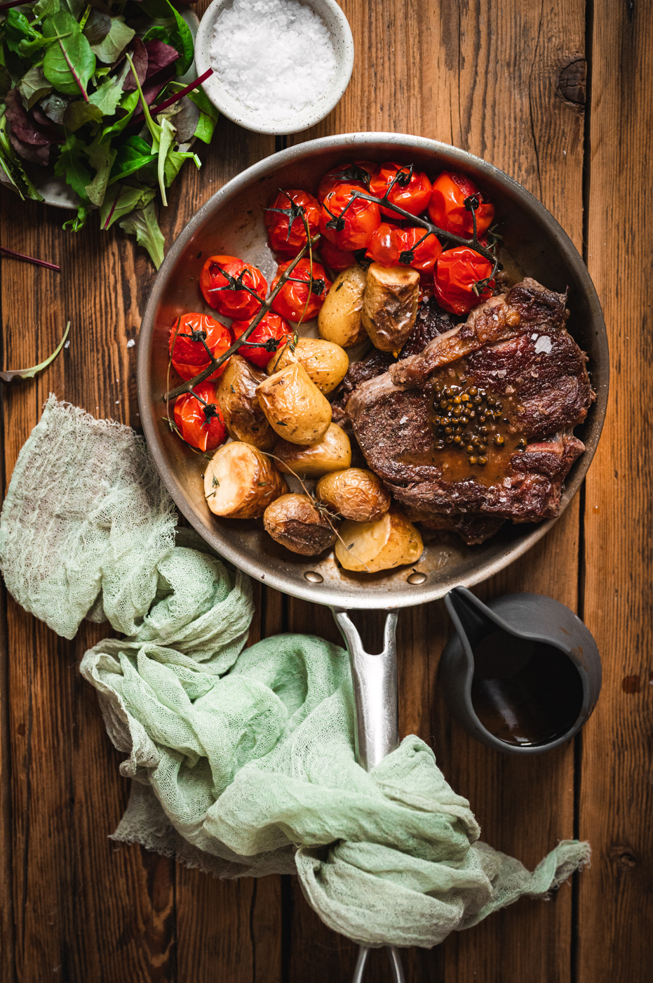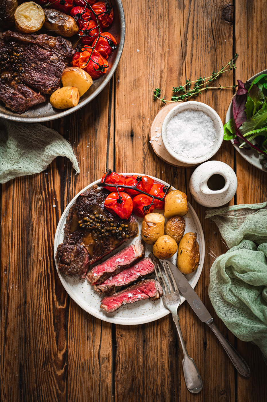 Možná stojí za zmínku také solení. To je takové věčné téma. Při mých studiích jsem se naučila, že solit předem je vlastně super, i když jsem se toho dříve bála. Steak tedy nasolte předem a nemějte strach. Čím větší kus masa, tím delší je potřeba doba nasolení. Když sůl pronikne do masa, ochutí ho i zevnitř a maso pak bude jemnější a zkrátka mnohem lepší. 🙂 K finálnímu solení požívám solný květ nebo sůl Maldon. Ten se sbírá v podobě křehkých vloček ze speciálních mořských políček třeba na Mallorce nebo ve Francii. Cena soli je sice vyšší, ale v kuchyni ji budete používat jen v menším množství přímo na talíř – má totiž úžasnou vlastnost přirozeně zvýraznit chuť pokrmů. 🙂 Sůl Maldon nemá tvar vloček, ale pyramidek, nicméně se také jedná o čistou krystalickou sůl výhradním původem z Anglie. Obě možnosti jsou skvělou volbou, protože obsahují spoustu stopových prvků z mořské vody.