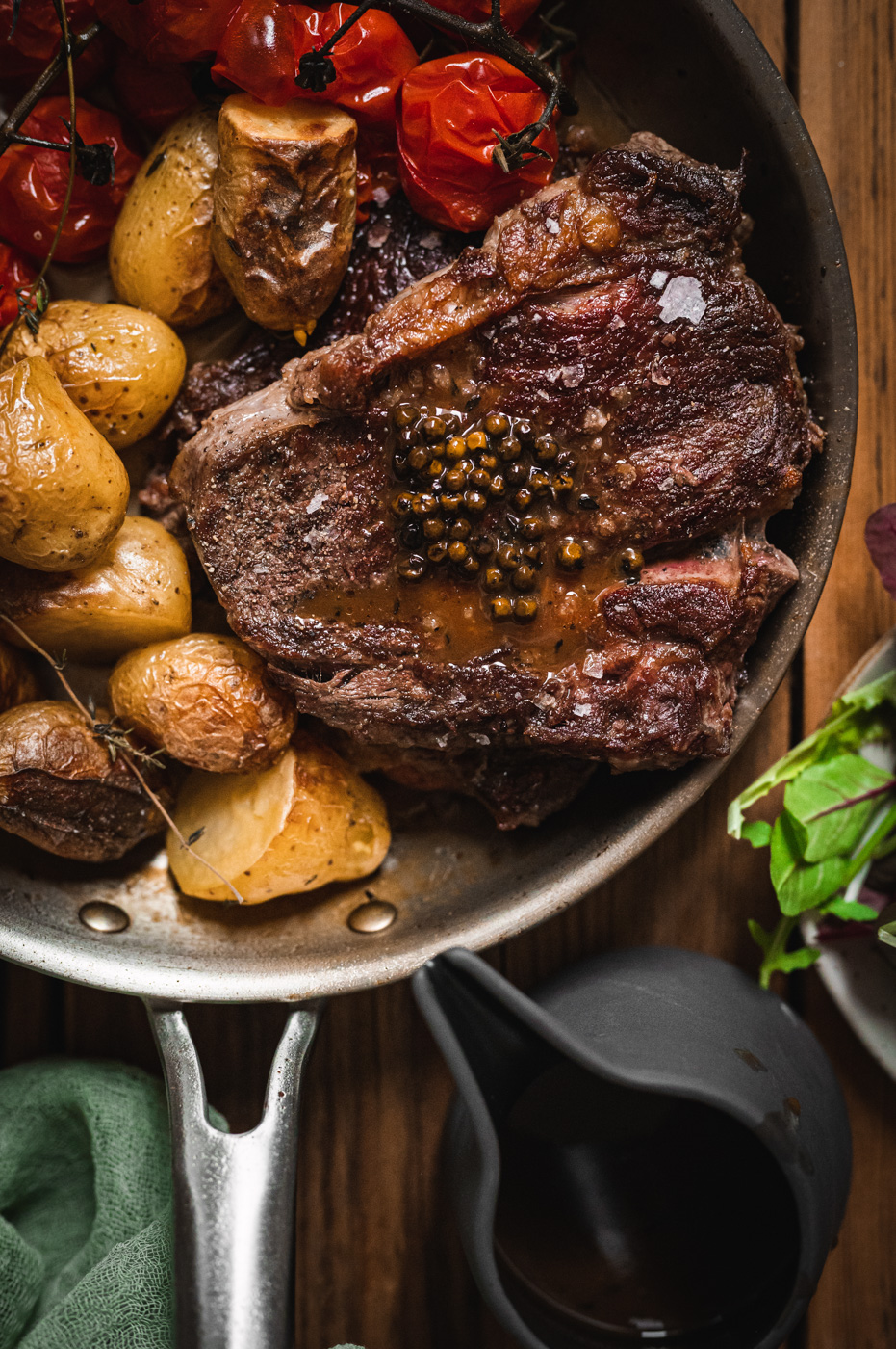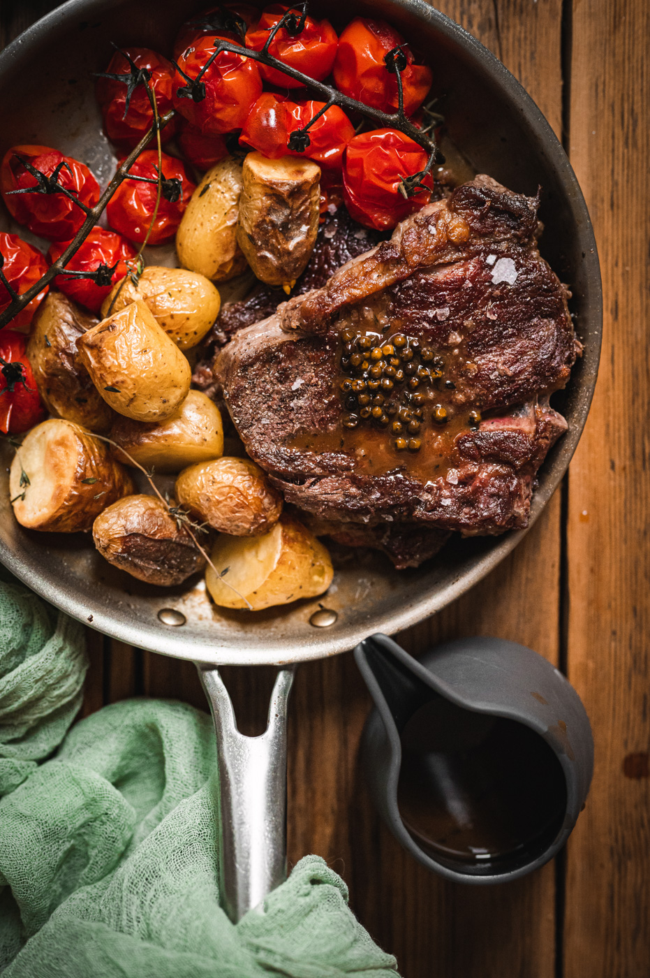 Steak z vysokého roštěnce s pečenými bramborami, rajčaty a pepřovou omáčkou