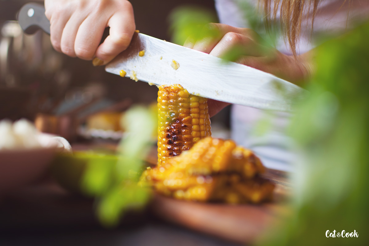 V malém rendlíku rozpusťte máslo. Kukuřici uprostřed rozpulte, polijte ji máslem a opečte na pánvi tak, aby byla místy zkaramelizovaná dohněda. Poté kolem dokola okrájejte klas a kukuřici pokrájejte ne menší kousky (mrkněte na video, tam je to dobře vidět :-)).