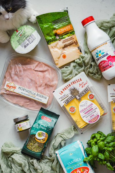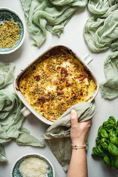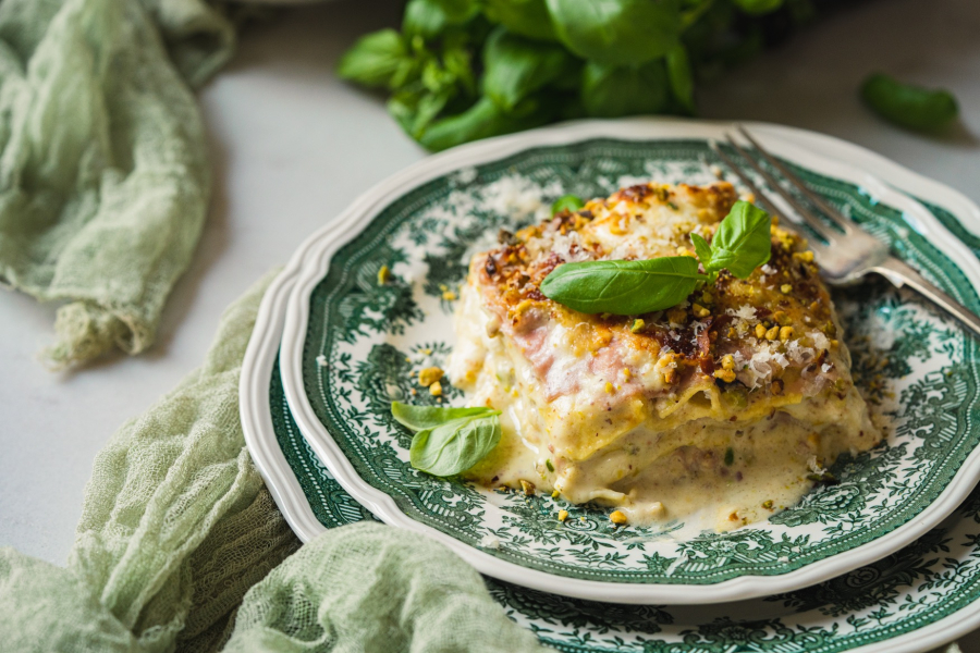 Těstoviny – bešamel – pistácie – mozzarella – parmazán – mortadela – bešamel a zase celé znovu 🙂