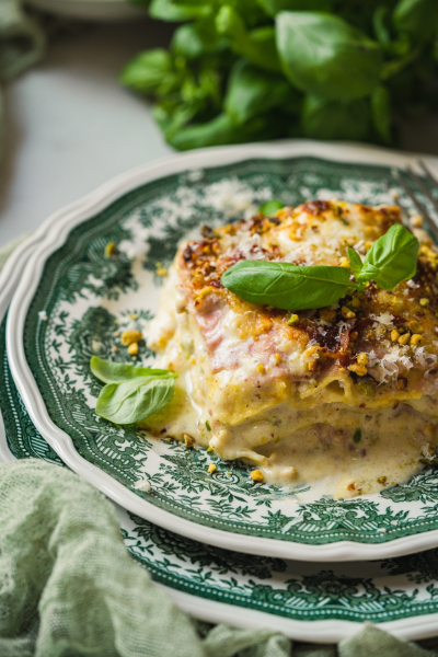 V jiném hrnci rozpusťte máslo, přidejte mouku a za stálého míchání smažte 45 vteřin. Nesmažte mouku déle, mohla by zhnědnout a bešamel už by nebyl typicky bílý. Hrnec sundejte z plotny a po částech přilívejte mléko. Energicky přitom šlehejte (ideální je na to omáčková metla či ta klasická), dokud nebude omáčka úplně hladká. Vraťte zpět na plotnu, přiveďte k varu a za stálého míchání vařte asi 3 minuty. Pak teplotu stáhněte na minimum a vařte 15 minut. Omáčku občas promíchejte odspodu, kvůli mouce se bude hodně přichytávat. Výsledkem by měla být hladká, lesklá omáčka, kterou na závěr dochutíte muškátovým oříškem, solí a pepřem. Poté vmíchejte pistáciové pesto.