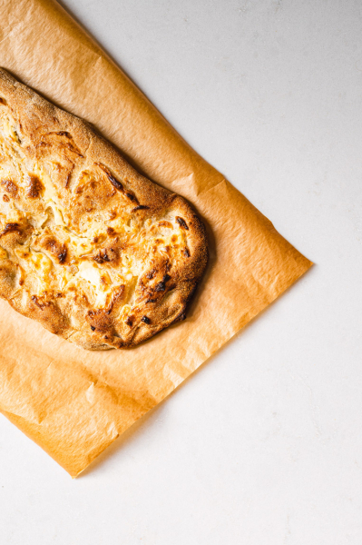 bešamel – kousky natrhané mortadely – mozzarella – pistácie – parmezán.