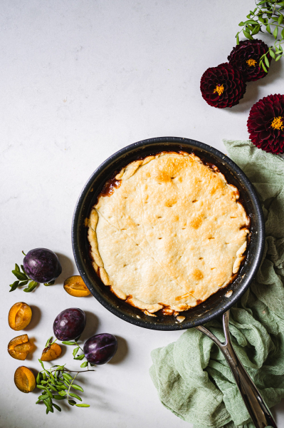 Pánev stáhněte z ohně. Připravené těsto opatrně přeneste na pánev a okraje pomocí dvou lžic jakoby zabalte pod švestky. Těsto několikrát propíchněte nožíkem a vložte do trouby. Pečte cca 45 minut, dokud nebude povrch krásně zlatavý. Hotový koláč vyndejte z trouby a nechte 5–10 minut odpočinout. Pokud budou kraje někde připečené, vařečkou je opatrně uvolněte. Poté na povrch pánve položte talíř a otočte tak, aby se koláč položil na talíř. 🙂 Doporučuji otáčet co nejrychleji, protože v koláči je spousta šťávy a mohla by vytéct. Níže se můžete podívat, jak se mi to poprvé krásně povedlo. 😀