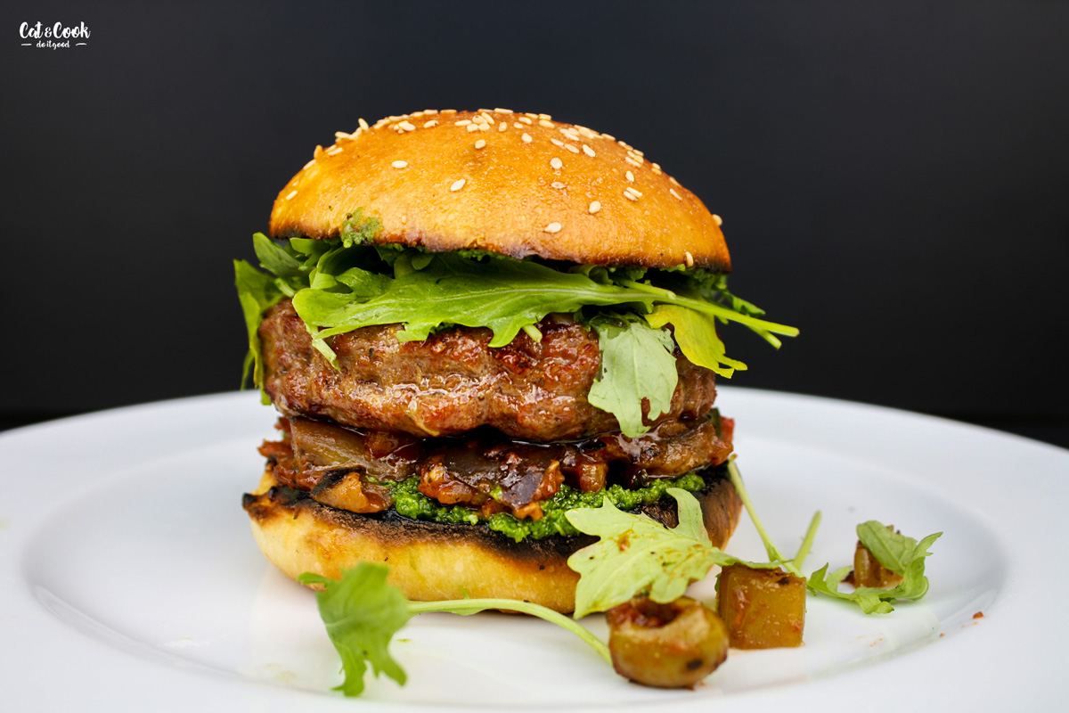 Opečenou housku potři pestem (nešetři :-)), přidej caponatu, odpočinuté maso, posol, popepři čerstvě mletým pepřem, navrch dej rukolu a přikryj bulkou.