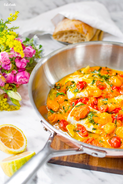 Rybu vložte do pánve s omáčkou a podávejte s bagetkou 🙂 Pokud máte doma červené nebo zelené pesto, můžete jím ještě rybu potřít.