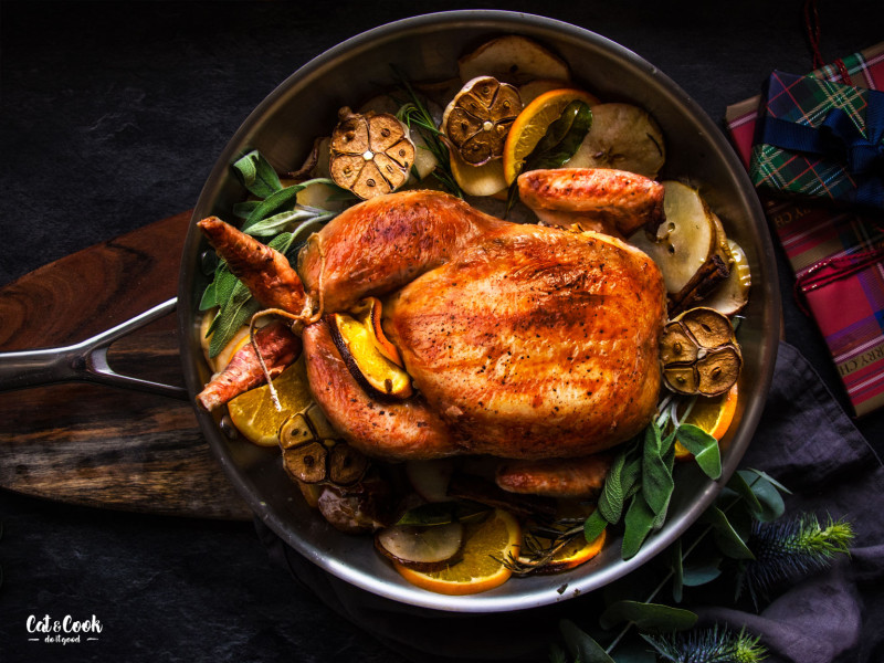 Až bude kuře hotové, přendejte ho na prkýnko, přikryjte alobalem a nechte ho alespoň 10 minut odpočívat, aby se uvnitř vyrovnaly šťávy. Poté kuře naporcujte a podávejte s pečeným ovocem a česnekem.