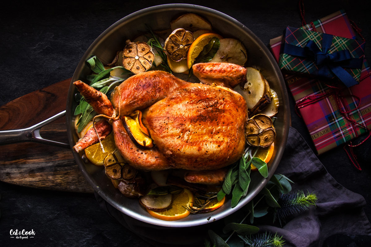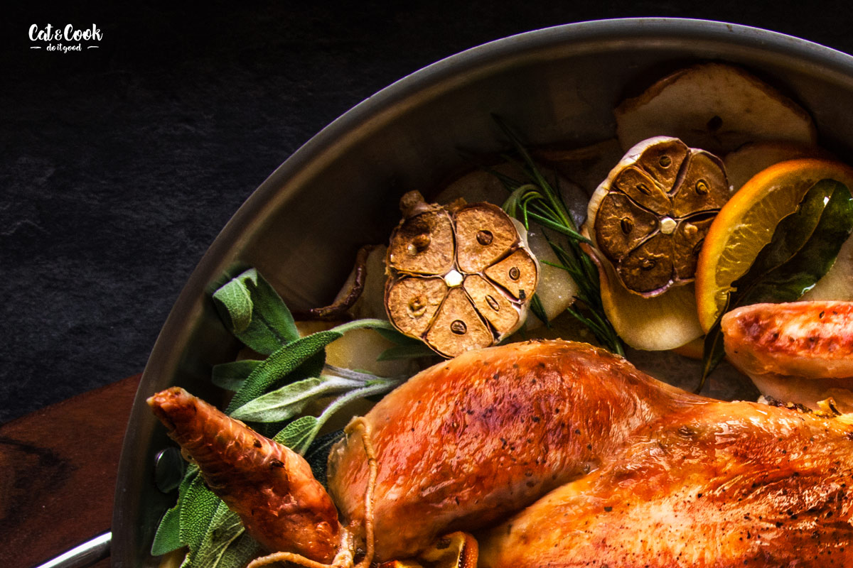 Tímhle voňavým kuřátkem oslníte celou rodinu! Máslíčko, bylinky a pečené ovoce vás prostě dostane. Pokud máte možnost, zajděte do M&S a kupte si přímo Oakham kuře, má 2 kg a je chuťově neskutečně výborné! 🙂