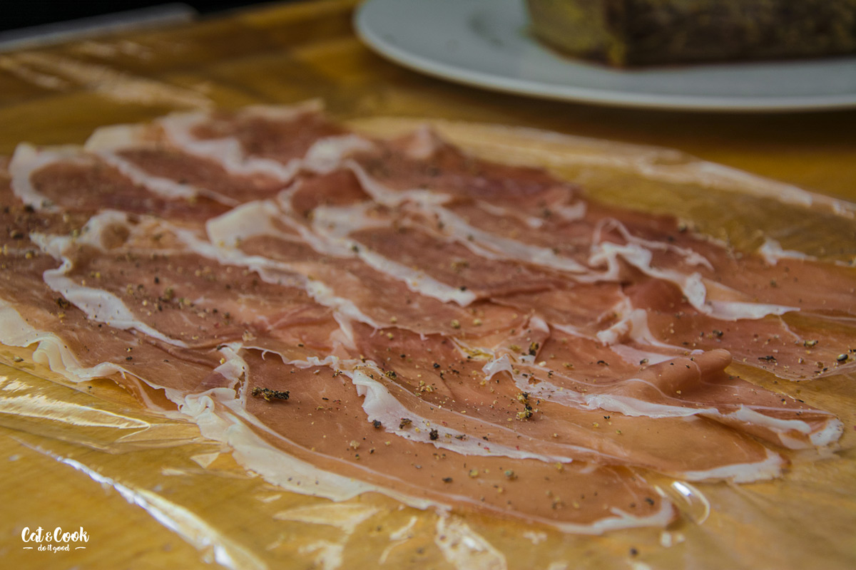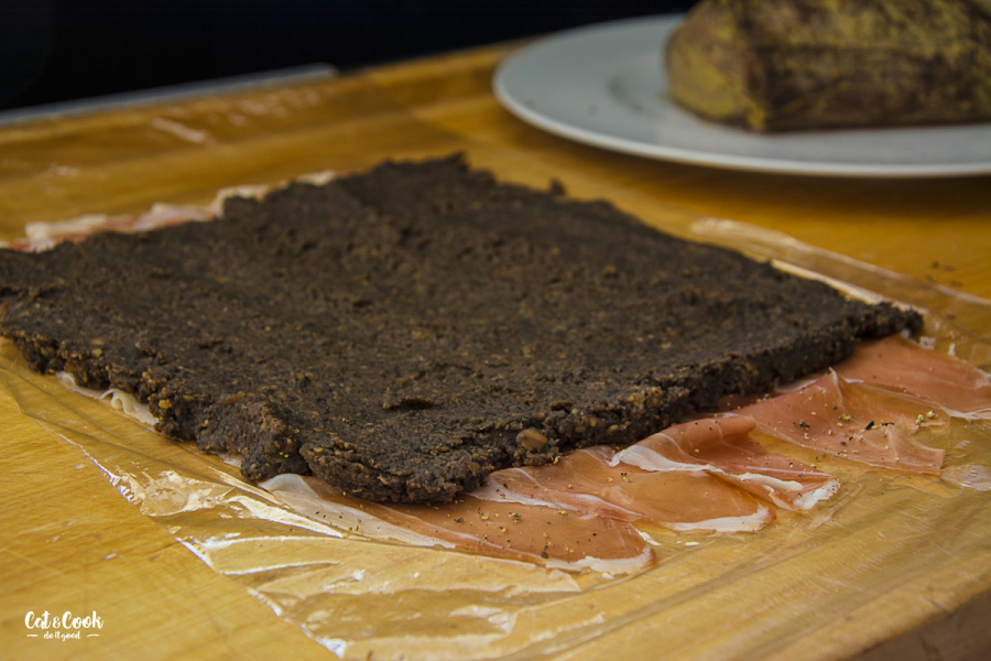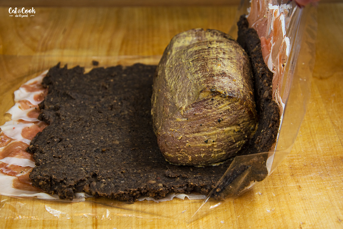 Přes prkénko si natáhněte fresh fólii a na ni naskládejte do tří řad parmskou šunku (jako na obrázku). Opepřete ji (nesolte, je slaná dost). Na šunku navrstvěte houbovou směs tak, aby šunka ze všech stran koukala minimálně 1 cm. Poté na spodní hranu položte maso a pomocí fólie zabalte. Zatočte do fólie co nejpevněji to jde a dejte na 30 minut do lednice ztuhnout.