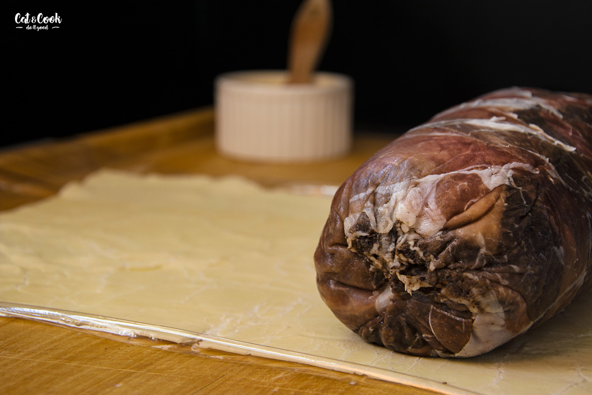 Přes prkénko si opět natáhněte fólii a na ni položte listové těsto. Mělo by být širší, něž zabalené maso. Vyndejte maso z lednice a položte na spodní část těsta. Opatrně zabalte, odřízněte zbytky těsta a pomocí fólie zatáhněte co nejpevněji. Opět dejte ztuhnout do lednice na 20 minut.