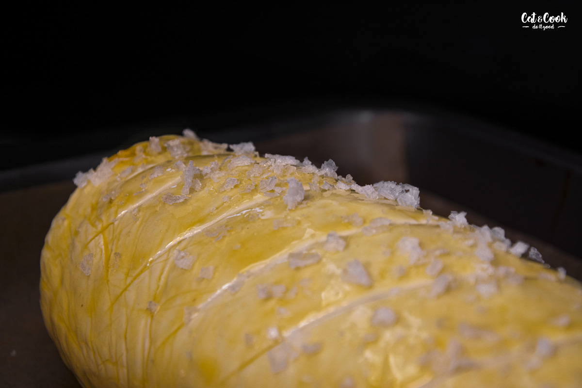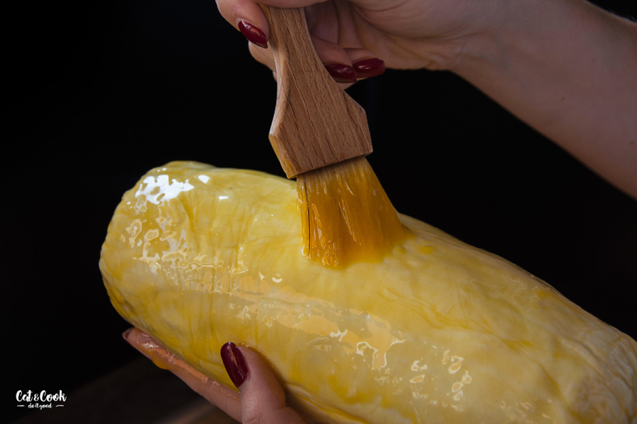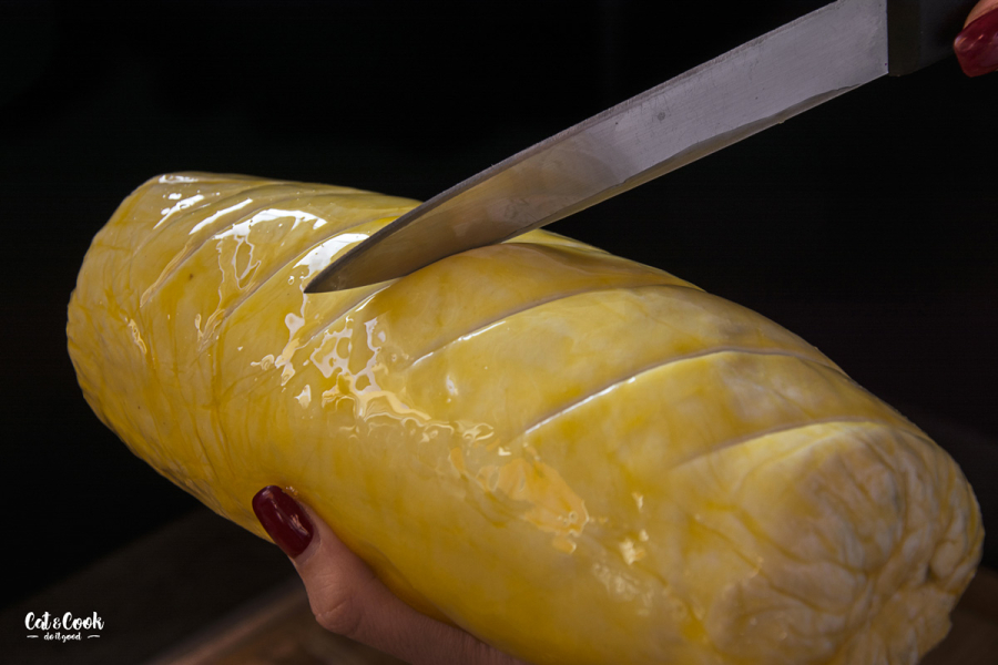 Troubu předehřejte na 200 stupňů. Opatrně svíčkovou rozbalte z fólie a pomažte žloutkem. Tupou stranou nože můžete udělat lehké zářezy. Pečte na plechu / v pekáčku asi 35 minut. Můžete hlídat vnitřní teplotu masa, která by měla mít asi 56 – 57 stupňů. Maximálně ale 60 stupňů. Stačí opatrně použít vpichový teploměr, abyste měli 100% jistotu.