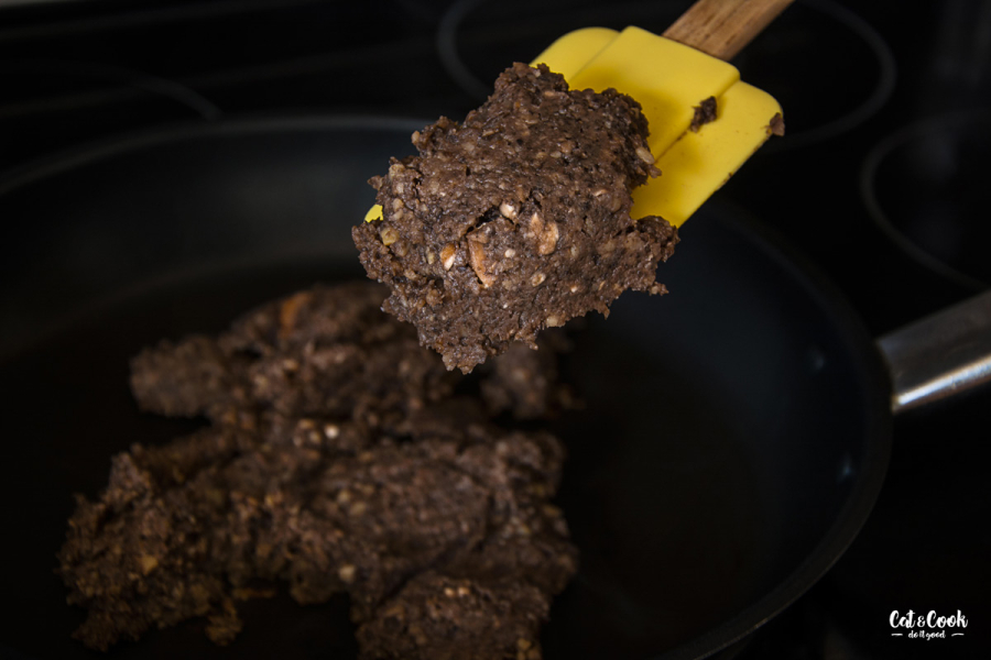 Do food procesoru vložte očistěné a nohou zbavené žampiony, kaštany, česnek, dvě špetky soli a špetku pepře. Rozmixujte dohladka. Nahřejte suchou pánev a vzniklou směs nasucho opražte. Cílem je, aby se vypařila přebytečná voda. Později by při pečení zbytečně vytékala skrz listové těsto. Trvá to asi 5 – 7 minut. Dejte stranou a nechte zchladnout.