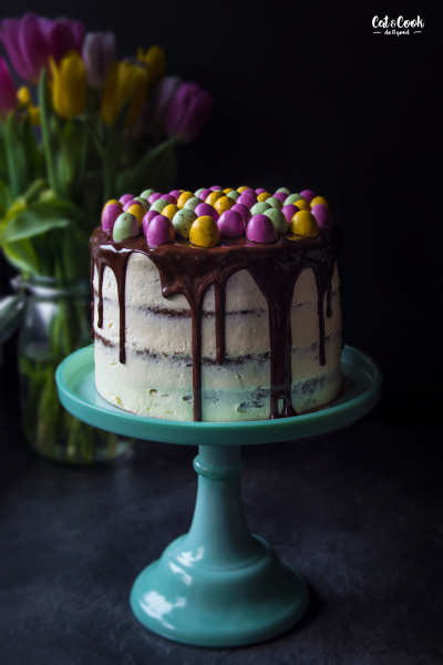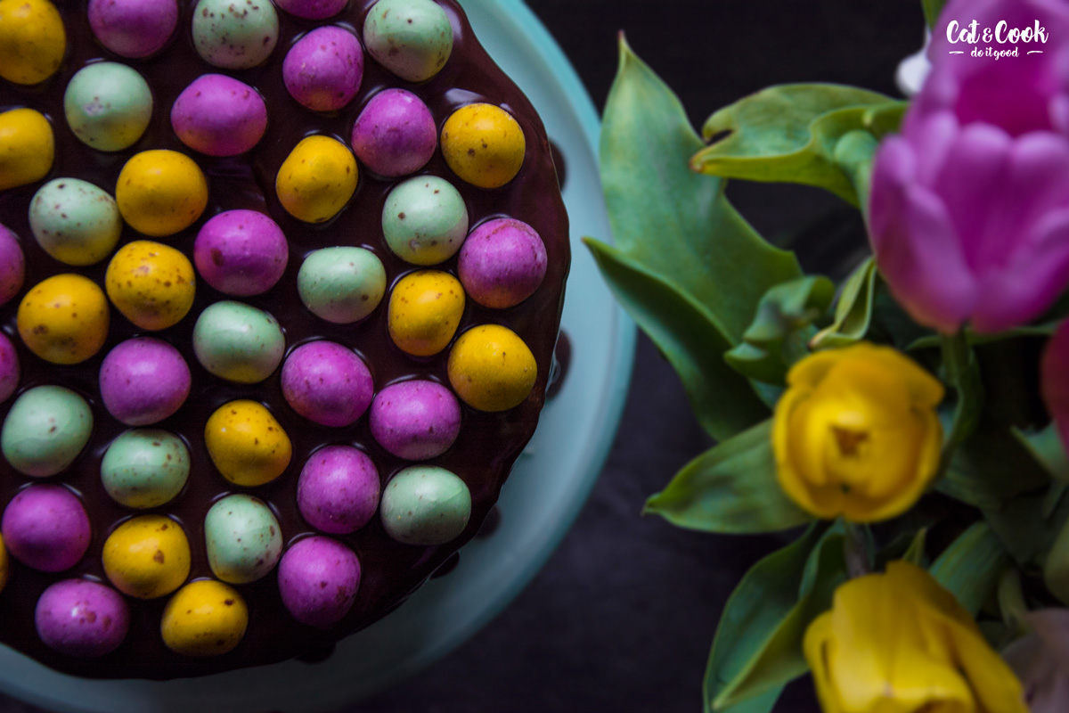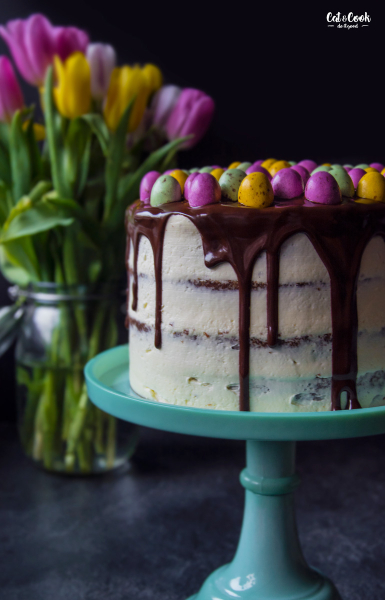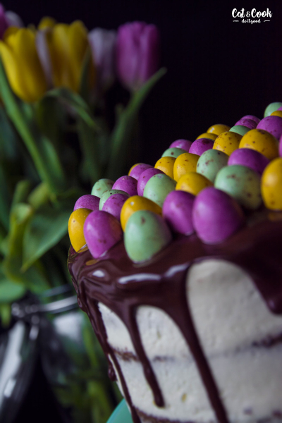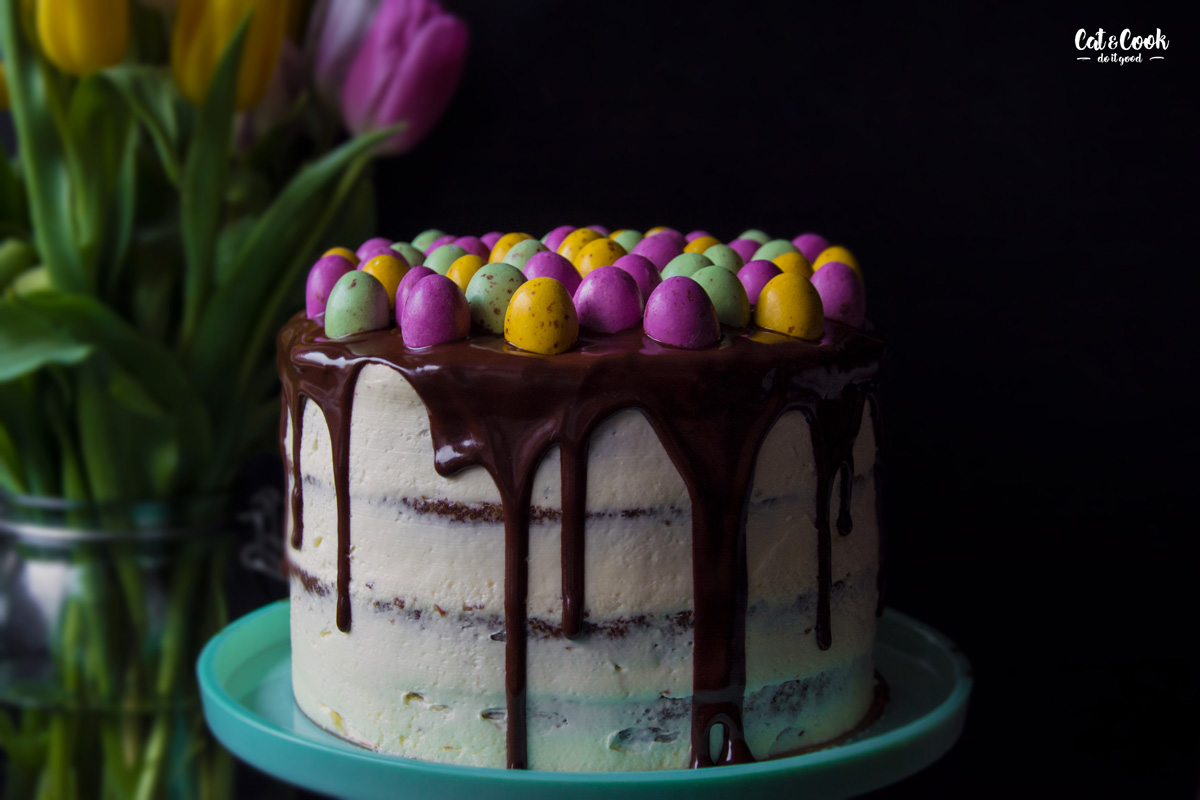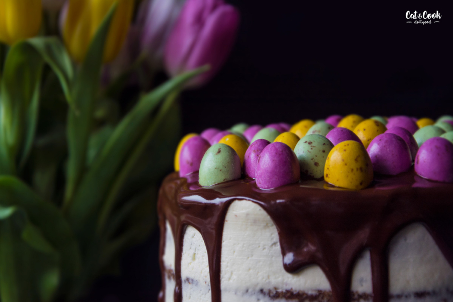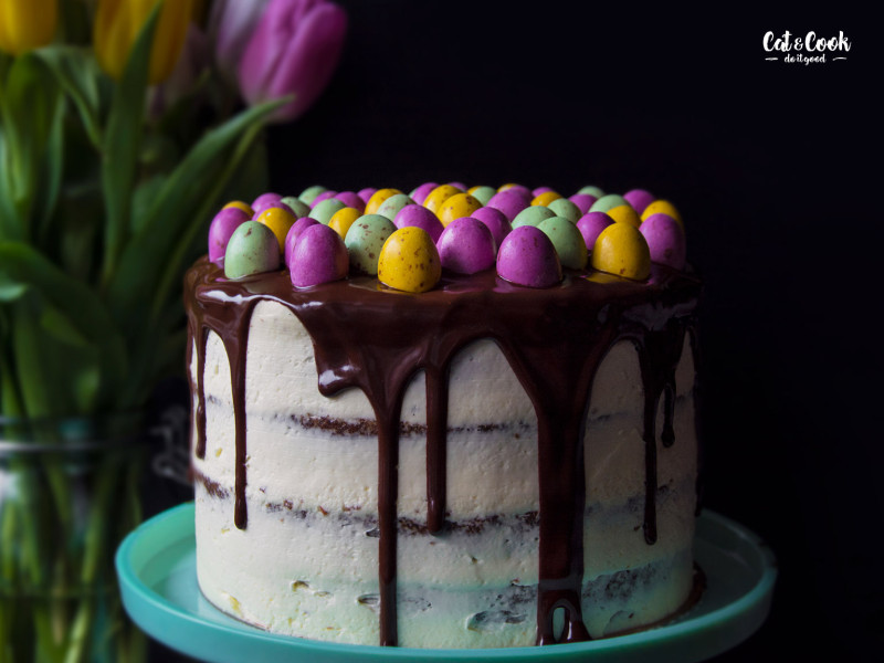Korpusy podélně rozřízněte (seřízněte vypouklé vršky) a promažte postupně krémem. Každý korpus můžete pomazat i slaným karamelem, ale není to nutné. Nakonec dort zahlaďte kolem dokola a dejte ztuhnout do lednice. Po 30 minutách ho přelijte rozpuštěnou čokoládou ve vodní lázni a opatrně poklaďte čokoládovými velikonočními vejci. Dejte opět zatuhnout do lednice a za hodinu je hotovo 🙂