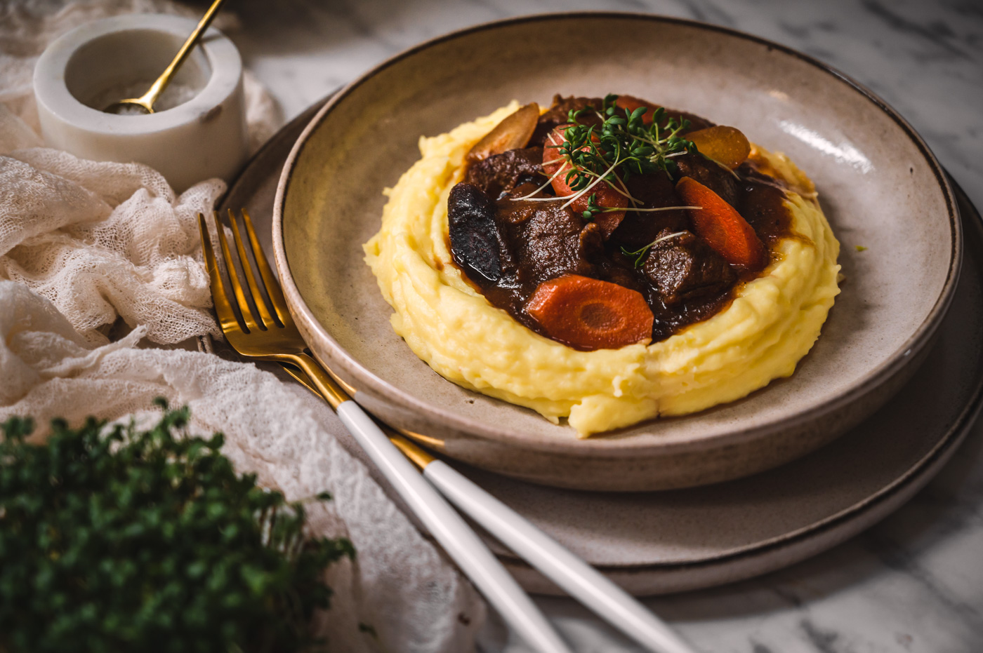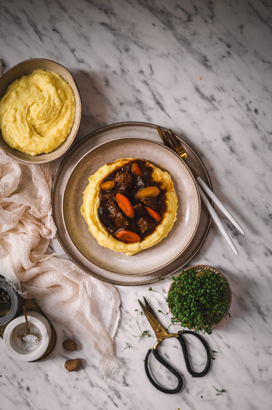 Maso řádně osolte a opepřete. Ideálně v litinovém hrnci rozehřejte máslo se sádlem a až bude horké, přidejte maso. Opečte ho dohněda ze všech stran a děrovanou naběračkou vyndejte do misky ven. Nechte ho stranou. Do toho samého hrnce nasypte mrkev a stáhněte plamen na střední stupeň. Restujte dozlatova a až poté přidejte cibuli. Cibule totiž karamelizuje mnohem dříve, proto je potřeba ji přidat déle, aby se nespálila. Nezapomínejte základ míchat a seškrabávat napečenou zeleninu, bude se hodně přichytávat (to je ale přesně to, co vaší omáčce dodá nezaměnitelnou chuť). Až bude cibule také orestovaná do zlatohněda, přidejte maso, kmín, promíchejte a zalijte horkým vývarem tak, aby maso bylo ponořené jen do tří čtvrtin. Zbytek vývaru si nechte na později.