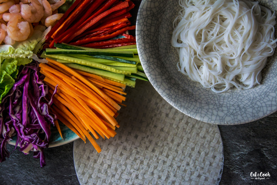 Zeleninu omyj, oloupej a nakrájej na „julienne“, tedy na úzké, dlouhé nudličky. Ze salátu odstraň tuhé středy a nakrájej na proužky. Zelí nakrouhej na nudličky. Krevety přeřízni podélně, vznikne ti tak 12 ks.