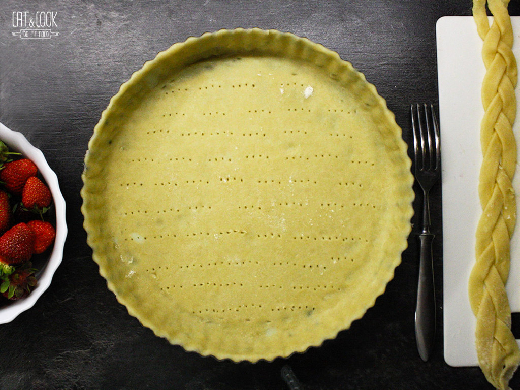 Těsto si podeber – buď válečkem nebo rukama a přemísti ho do máslem vymazané formy (použij koláčovou nebo dortovou formu s odnímatelným dnem). Pouze konečky prstů ho vtlač do formy, aby na celé ploše těsto těsně přiléhalo ke stěně a dnu. Okraje by měly mít tloušťku až 8 mm, což znamená, že při vtlačování těsta k okrajům bychom měli prsty druhé ruky zároveň tlačit na okraj směrem dolů, aby těsto nebylo až tolik do výšky, ale přibylo na tloušťce. Pokud těsto přečnívá přes okraj, tupou stranou nože nebo prsty ho odstraň.