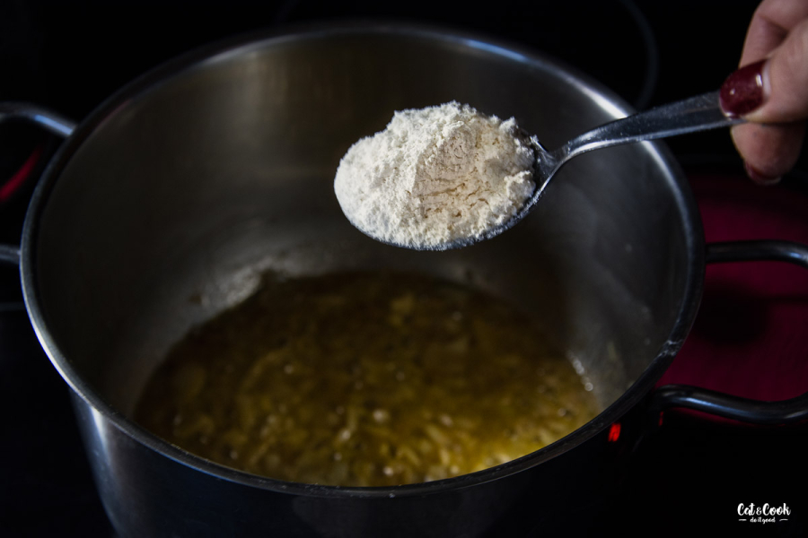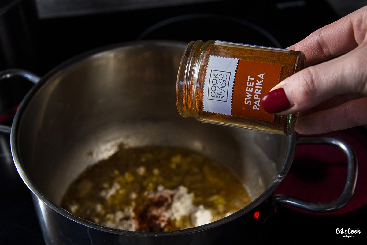 Cibuli nakrájejte na kostičky a na střední ohni ji zpěňte na másle. Až zesklovatí, zasypte ji paprikou a kmínem. Jen minutku míchejte a zaprašte moukou. Máslová jíška je hotová, když se krásně spojí s tukem a začne vonět. Trvá to maximálně dvě minuty. Poté jíšku zalijte studeným vývarem a přiveďte k varu. Je potřeba polévku stále míchat, aby se jíška nepřichytila ke dnu.